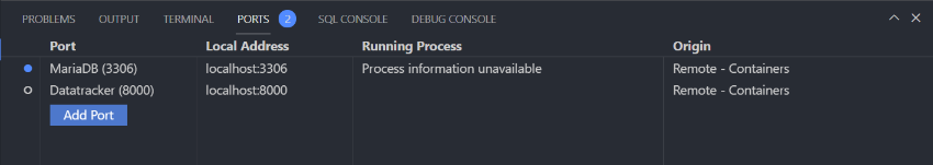 F1), the command Run Test Task allows you to choose between running all tests or just the javascript tests.The Ports panel, found in the Terminal area, shows the ports currently mapped to your host and if they are currently listening.